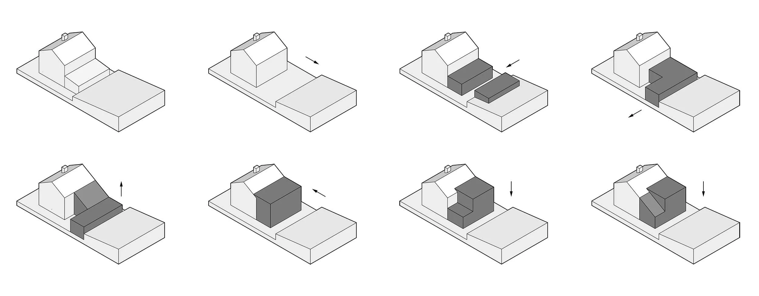 A series of architectural process models show the considered proposed forms in relationship with the existing building. By extending the sloped roofline, the extension harmonises with the side (approach) elevation as not to overly impose on the existing house. This design process rationalised the mass to create a contemporary and considered extension.